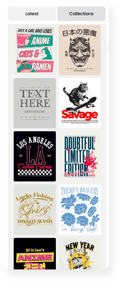 Find a design that resonates with your audience and favorite products. Apply designs across your entire merch range.